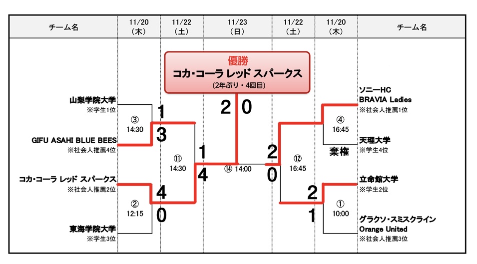 20日の試合結果により、準決勝の相手は、日本リーグ、国民体育大会と優勝している、コカ・コーラレッドスパークスと対戦となりました。