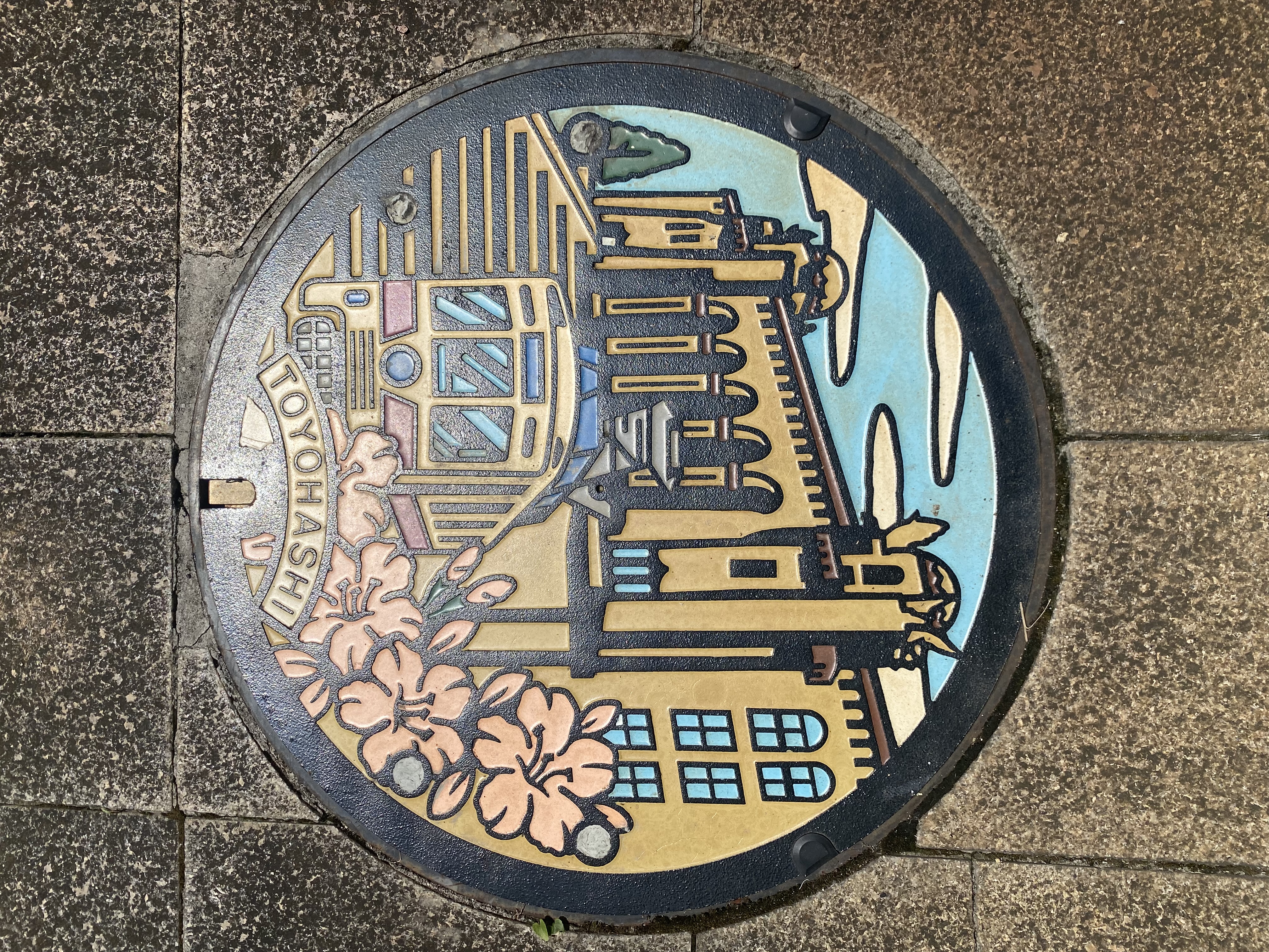 国の登録有形文化財である「豊橋市公会堂」を背景に、市電の愛称で親しまれている「路面電車」と、市の花である「ツツジ」がデザインされています。