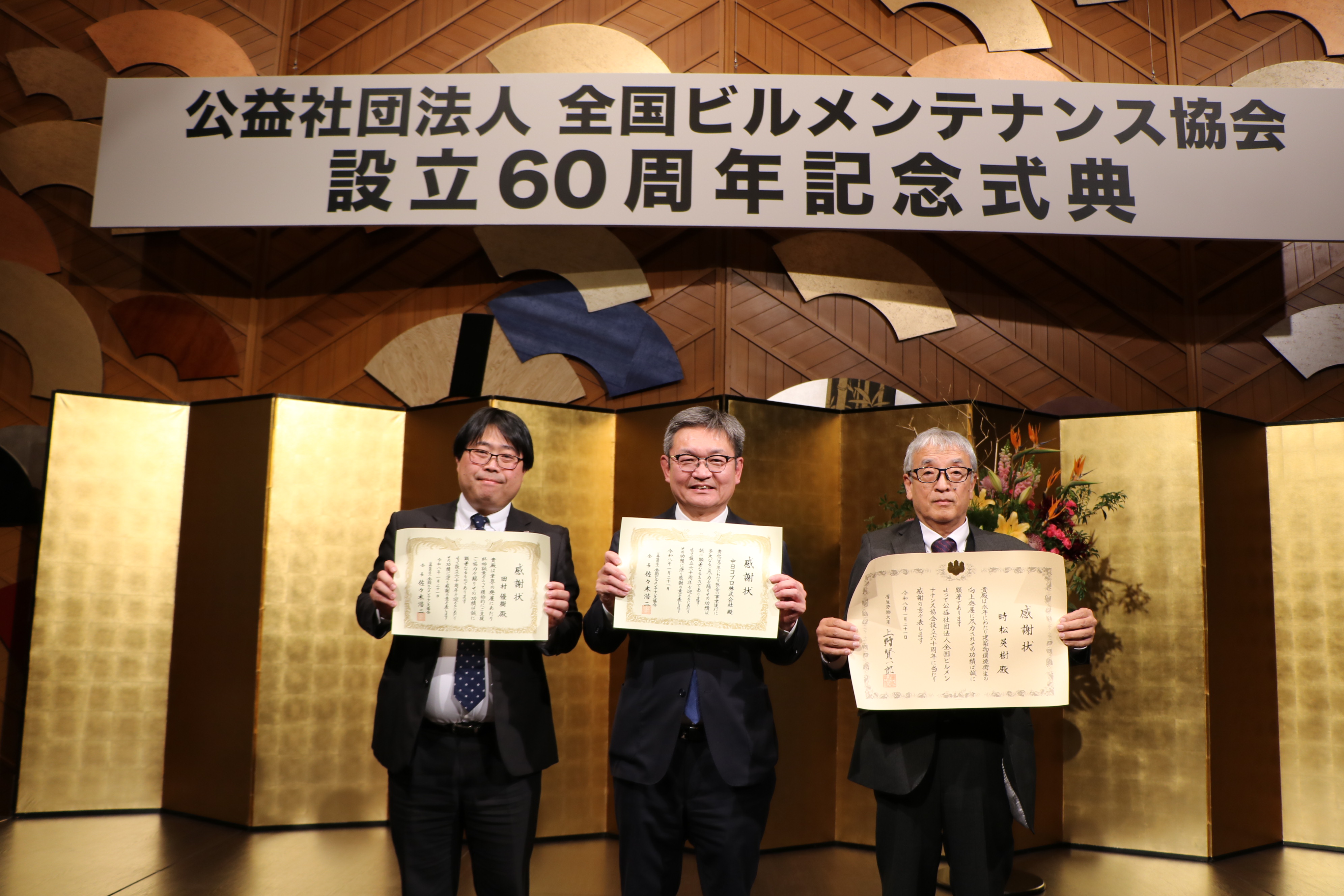 私共も長年参加している業界団体『全国ビルメンテナンス協会』が本年60周年を迎え、その記念式典において、弊社が会社として、また仲間の3名が協会事業の講師としての功績で表彰されました。